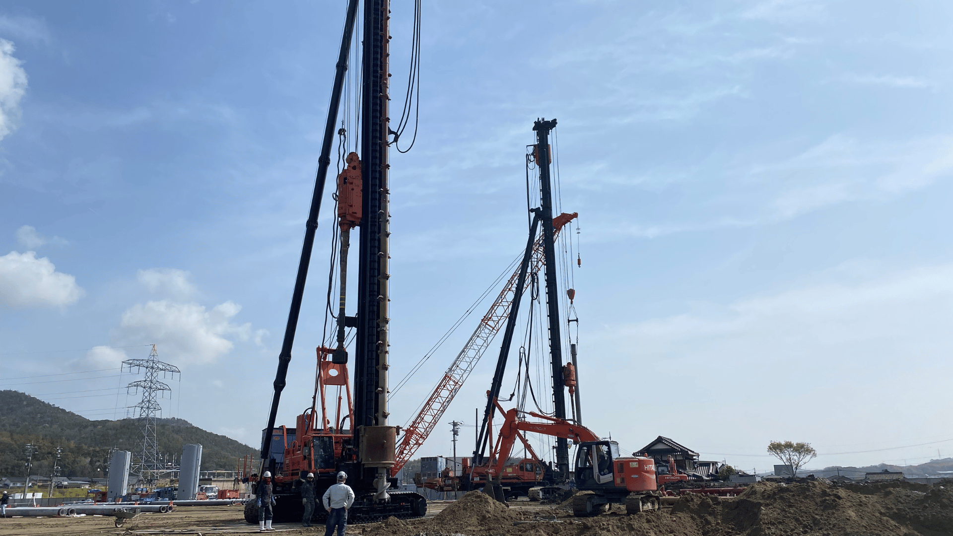 建物の土台部分を支える杭工事を行っています。国内ゼネコン、パイルメーカー、商社等からの仕事を請け負っており、岡山県を中心に中四国、九州、関西方面等幅広いエリアで施工しています。